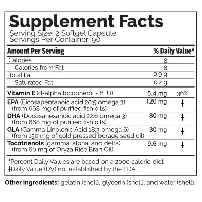The EPA and DHA are in the form of triglycerides derived from marine lipids (using patented flash molecular distillation) and the GLA is from cold-pressed borage seed oil. The mixed tocotrienols and tocopherols derive from rice bran oil, and are included in the softgel capsules for antioxidant protection of the polyunsaturated oils.