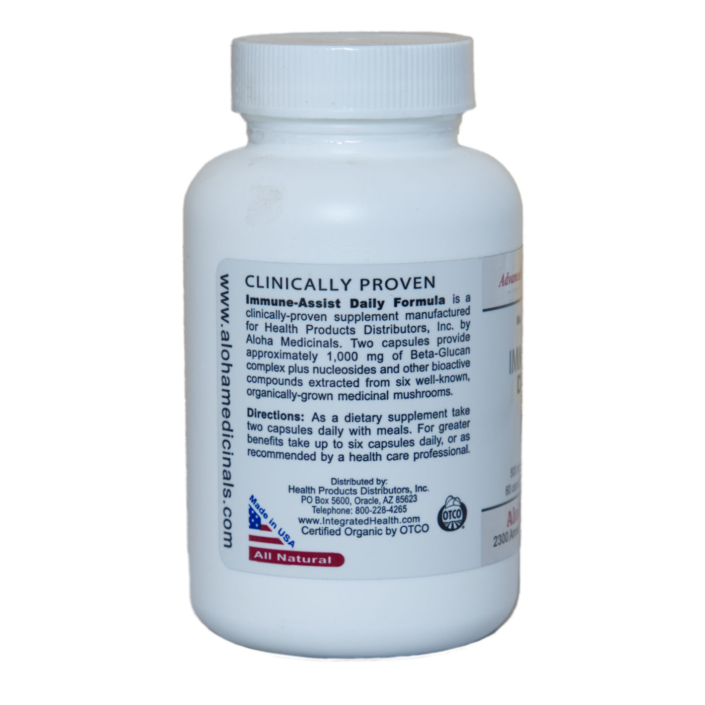 IMMUNE-ASSIST™ Daily Formula includes a combination of more than 200 different polysaccharides, derived from the enzymatic breakdown of complex organic plant material from six different species of organically grown medicinal mushrooms.These include Agaricus blazei, Cordyceps sinensis and Cordyceps militaris, Lentinula edodes (shiitake), Grifola frondosa (maitake), Ganoderma lucidum (Reishi), and Coriolus versicolor. IMMUNE-ASSIST™ Daily Formula contains 500 mg per vegetarian capsule and is made in USA using only USDA-certified organic materials.
